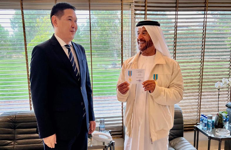 وتم تقليد سموه ميدالية اليوبيل خلال لقائه صباح امس بقصره في أبوظبي سعادة ماديار مينيليكوف سفير جمهورية كازاخستان لدى الدولة.