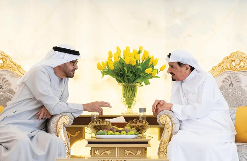 ودعا سموهما المولى عز وجل أن يديم على دولة الإمارات نعم الأمن والاستقرار والرخاء ويوفق قيادتها في العمل لكل ما فيه الخير للوطن وشعبه. حضر اللقاء .. سمو الشيخ عمار بن حميد النعيمي ولي عهد عجمان وسمو الشيخ نهيان بن زايد آل نهيان رئيس مجلس أمناء مؤسسة زايد بن سلطان آل نهيان للأعمال الخيرية والإنسانية والفريق سمو الشيخ سيف بن زايد آل نهيان نائب رئيس مجلس الوزراء وزير الداخلية وسمو الشيخ منصور بن زايد آل نهيان نائب رئيس مجلس الوزراء وزير شؤون الرئاسة وسمو الشيخ حمدان بن محمد بن زايد آل نهيان والشيخ محمد بن حمد بن طحنون آل نهيان مستشار الشؤون الخاصة في وزارة شؤون الرئاسة والشيخ أحمد بن حميد النعيمي ممثل الحاكم للشؤون الإدارية والمالية والشيخ عبد العزيز بن حميد النعيمي رئيس دائرة التنمية السياحية والشيخ راشد بن حميد النعيمي رئيس دائرة البلدية والتخطيط والشيخ صقر بن راشد النعيمي ومعالي الشيخ الدكتور ماجد بن سعيد النعيمي والشيخ حميد بن عمار النعيمي والشيخ محمد بن علي النعيمي رئيس محكمة عجمان والشيخ سلطان بن علي النعيمي وعدد من الشيوخ والمسؤولين.