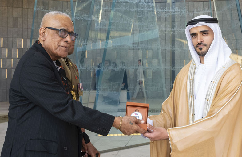 واستعرض فخامة رئيس جمهورية فيجي، يرافقه سموّ الشيخ زايد بن محمد بن زايد آل نهيان، حرس الشرف الذي اصطفَّ لتحيته، ثمَّ وضع إكليلاً من الزهور أمام نصب الشهيد.