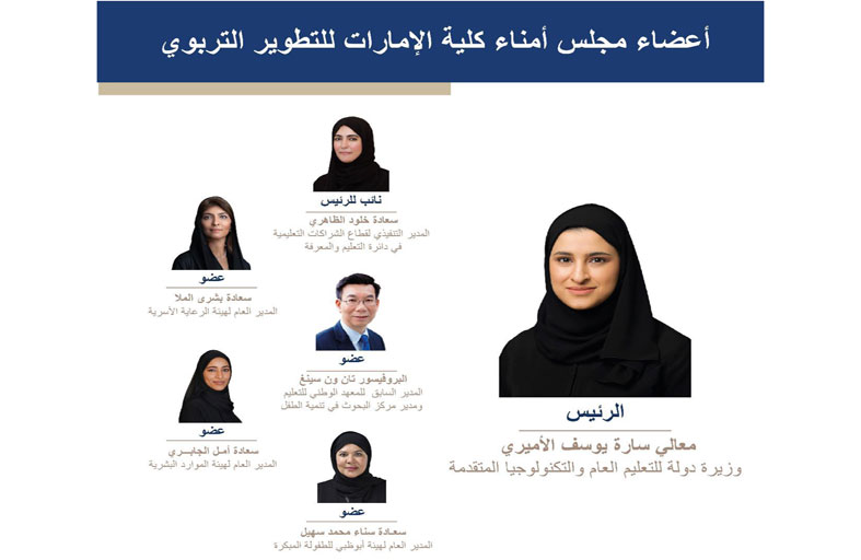 ويتكون مجلس الإدارة الجديد من سعادة خلود الظاهري (نائب الرئيس) المدير التنفيذي لقطاع الشراكات التعليمية في دائرة التعليم والمعرفة – أبوظبي وسعادة الدكتورة بشرى عبدالله الملا (عضو)، المدير التنفيذي لقطاع تنمية المجتمع في دائرة تنمية المجتمع - أبوظبي وسعادة أمل ناصر الجابري (عضو)، المدير العام لهيئة الموارد البشرية لإمارة أبوظبي وسعادة سناء محمد سهيل (عضو)، المدير العام لهيئة أبوظبي للطفولة المبكرة و بروفيسور تان أون سينج (عضو)، مدير مركز البحث في تنمية الطفل (CRCD) ، المعهد الوطني للتربية (NIE).