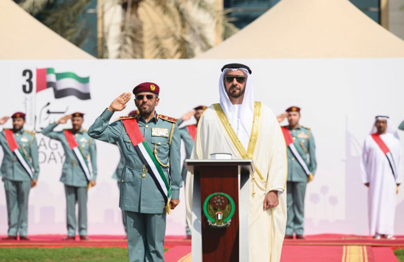 شهد الفريق سمو الشيخ سيف بن زايد آل نهيان نائب رئيس مجلس الوزراء وزير الداخلية الاحتفالية التي نظمتها وزارة الداخلية لرفع علم الدولة على سارية مبنى الوزارة بالتزامن مع رفعه عالياً خفاقاً على كافة مباني إدارات وقطاعات الوزارة، وعلى مباني القيادات العامة للشرطة بمناسبة احتفال الدولة بـ "يوم العلم".