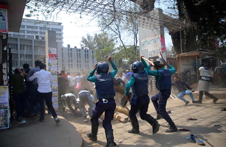 أصيب عشرات المتظاهرين بجروح أمس الأحد بعدما أطلقت الشرطة الرصاص المطاطي والغاز المسيل للدموع على ناشطين من المعارضة بهدف منع احتجاجات جديدة على وفاة كاتب معروف في السجن، كما قالت الشرطة ومسؤول حزبي. وأظهرت لقطات مباشرة لمحطة “تشانيل 24” التلفزيونية المحلية، طريقا أمام نادي الصحافة الوطني - موقع مفضل للاحتجاج في العاصمة دكا - يتحول إلى ساحة معركة فيما تقوم الشرطة بضرب المتظاهرين بالهراوات لتفريقهم. وقال نائب مفوض شرطة دكا سازادور الرحمن لوكالة فرانس برس إن الاشتباكات اندلعت عندما قام ناشطون من الحزب الوطني المعارض في بنغلادش برشق حجارة ومهاجمة الشرطيين بأنابيب بلاستيكية، ما دفع الشرطة إلى الرد “بإطلاق الرصاص المطاطي والغاز المسيل للدموع». وأضاف “لم يأخذوا أي تصريح” لتنظيم تظاهرة مدافعا عن تحركات الشرطة لتفريق المحتجين.