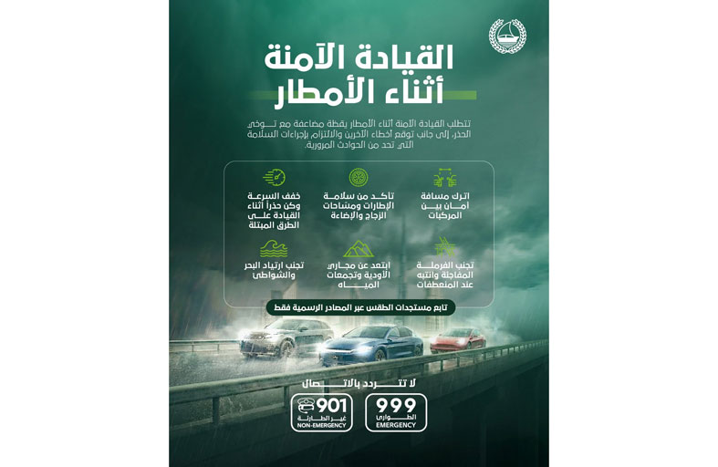حثت القيادة العامة لشرطة دبي، السائقين على ضرورة توخي الحيطة والحذر اللازمين على الطرقات خلال هطول الأمطار، واتباع جميع الإجراءات الوقائية والالتزام التام بالقوانين واللوائح المرورية وتخفيف السرعات، وترك مسافة أمان كافية، وعدم الانشغال بغير الطريق.