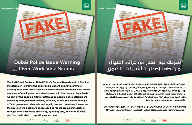 حذر مركز مكافحة الاحتيال بالإدارة العامة للتحريات والمباحث الجنائية في شرطة دبي، من جرائم احتيال على أشخاص بدعوى تقديم وعد لهم بإصدار تأشيرات عمل دون وجود سند حقيقي لهذا الوعد، مؤكداً أهمية التوجه إلى الجهات الرسمية والمكاتب المُعتمدة قانوناً، والمعنية بإنهاء أي إجراءات تتعلق بإصدار التأشيرات، ومتابعة التوجهات ذات الصلة بالاشتراطات والمتطلبات.