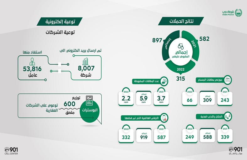 وبين العميد المعصم أن الحملة التوعوية التي نُفذت هذا العام عبر البريد الالكتروني، استفاد منها 8007 شركات، ووصلت إلى 53 ألفاً و816 عاملاً، ووزعت 600 ملصقٍ توعوي على الشركات العقارية، إلى جانب إرسال رسائل نصية توعوية، وما زالت الحملة مستمرة وصولاً إلى جميع مناطق دبي.