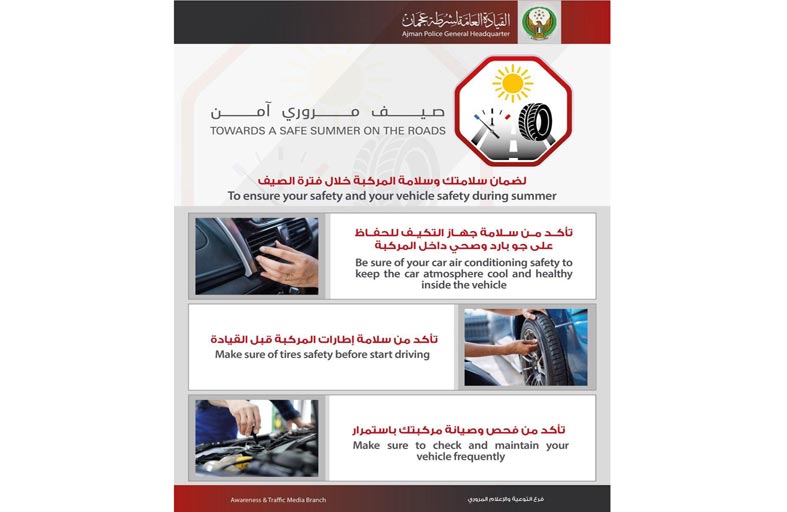 وأوضح أن الحملة تهدف إلى توعية السائقين بأهمية اتخاذ كافة الاحتياطات المتعلقة بسلامة المركبة، وإجراء الصيانة الدورية، واتخاذ التدابير اللازمة كفحص الإطارات والتأكد من جودتها مع دخول فصل الصيف وارتفاع درجات الحرارة وعمل صيانة شاملة للسيارة والتأكد من خلوها من الأعطال التي يمكن أن تؤثر على القيادة وغيرها من التدابير اللازمة لتأمين القيادة على الطريق، مشيراً إلى أن الحملة تستهدف جميع فئات المجتمع عبر قنوات الإعلام المختلفة كالإذاعة والتلفزيون والصحف و وسائل التواصل الاجتماعي للوصول إلى أوسع نطاق ممكن لدعم نجاح الحملة. ودعا مدير إدارة المرور والدوريات بشرطة عجمان السائقين إلى توخي الحيطة والحذر أثناء السفر عبر البر، والالتزام بالقوانين المرورية، وعدم تجاوز السرعة المحددة للطريق لضمان صيف آمن، متمنياً السلامة للجميع.
