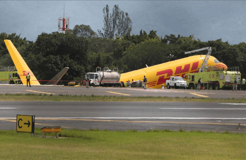تعرضت طائرة شحن للبريد والطرود إلى حادثة غريبة عندما انشطرت إلى جزأين خلال هبوط اضطراري على مدرج مطار خوان سانتاماريا في سان خوسيه في كوستاريكا . ولم يسفر الحادث عن سقوط ضحايا، كما أعلنت السلطات، التي أشارت في الوقت ذاته إلى أنه أدى إلى إغلاق المطار مؤقتا. وقال رئيس إدارة المطافئ في كوستاريكا هكتور تشافيز في تصريحات صحفية إن "الشخصين، اللذين كانا على متن الطائرة، بصحة جيدة" بحسب ما ذكرت فرانس برس.