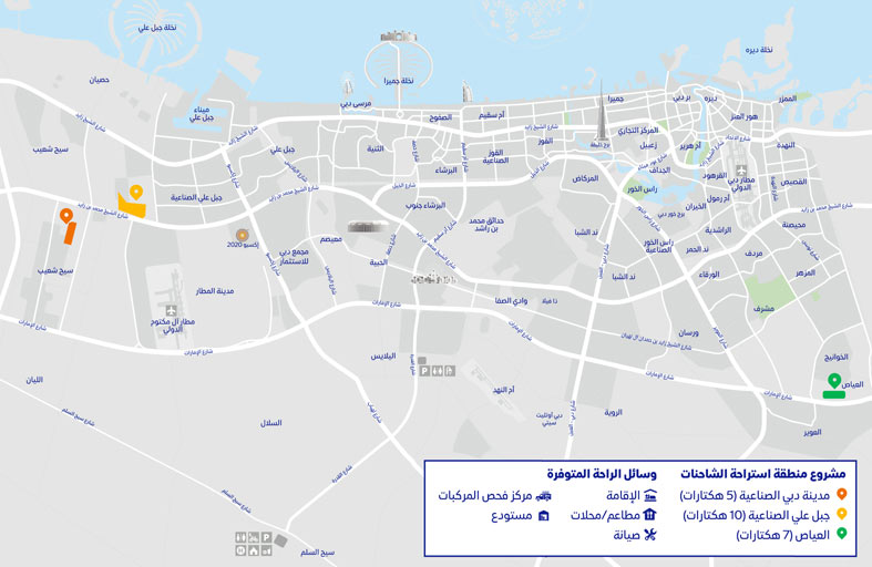 وأوضح الطير أن مساحة الموقع الأول الذي يقع بالقرب من منطقة جبل علي الصناعية الثالثة باتجاه إمارة أبوظبي تبلغ 100 ألف متر مربع وتتسع لعدد يتراوح من 170 إلى 200 شاحنة فيما تبلغ مساحة الموقع الثاني الواقع على شارع الإمارات بالقرب من مدخل إمارة الشارقة 70 ألف متر مربع وتتسع لعدد يتراوح من 130 إلى 150 شاحنة أما الموقع الثالث فيقع في مدينة دبي الصناعية بالقرب من شارع الشيخ محمد بن زايد وتبلغ مساحته 50 ألف متر مربع ويتسع لعدد يتراوح من 90 إلى 100 شاحنة ..مشيرا إلى أن المحطات المزمع إنشاؤها تضم حزمة متكاملة من الخدمات التي تلبي جميع الاحتياجات الأساسية واليومية لسائقي الشاحنات والمركبات الثقيلة مثل مراكز فحص فني متخصصة للمركبات الثقيلة ومراكز خدمات الصيانة ومخازن ومطاعم ومحلات تجارية واستراحات.