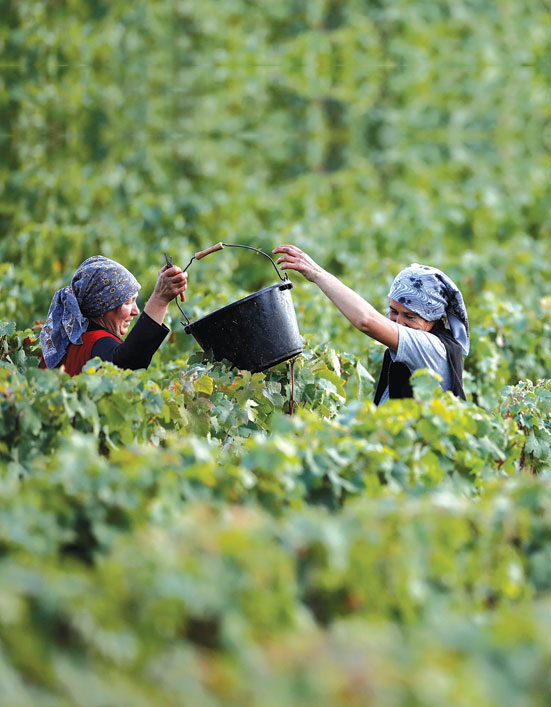 عاملتان تجمعان العنب في مزرعة في تايتنجر أثناء الحصاد التقليدي في بييري، بالقرب من إبيرناي، فرنسا.  رويترز