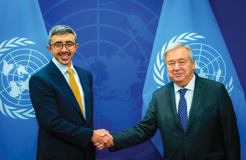 التقى سمو الشيخ عبدالله بن زايد آل نهيان وزير الخارجية معالي أنطونيو غوتيريس الأمين العام للأمم المتحدة، وذلك على هامش أعمال الدورة الـ 78 من الجمعية العامة للأمم المتحدة في نيويورك.وتناولت مباحثات سموه مع غوتيريس الشراكة بين دولة الإمارات ومنظمة الأمم المتحدة ووكالاتها وبرامجها المختلفة في مختلف المجالات ، ومنها الإنسانية والطاقة المتجددة والمناخ والتنمية المستدامة.كما استعرض الجانبان مخرجات عضوية دولة الإمارات في مجلس الأمن خلال الفترة 2022 – 2023 ، واسهامات الدولة البارزة في العمل متعدد الأطراف لخدمة السلم والأمن الدوليين ، واستجاباتها الإنسانية الفورية لكافة التحديات العالمية ، بالإضافة إلى جهودها الرائدة ومبادراتها المبتكرة لمعالجة العديد من التحديات الملحة وفي مقدمتها تغير المناخ.كما ناقش سمو الشيخ عبدالله بن زايد آل نهيان ومعالي أنطونيو غوتيريس استعدادات دولة الإمارات لاستضافة مؤتمر الأطراف في اتفاقية الأمم المتحدة الإطارية بشأن تغير المناخ "COP 28" شهري نوفمبر وديسمبر المقبلين في مدينة إكسبو دبي.