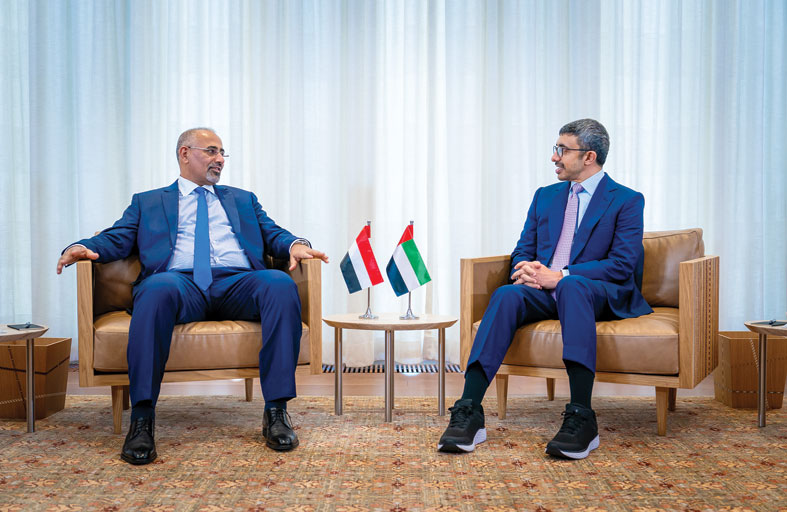 التقى سمو الشيخ عبدالله بن زايد آل نهيان وزير الخارجية ، معالي عيدروس الزبيدي نائب رئيس مجلس القيادة الرئاسي اليمني ، وذلك على هامش أعمال الدورة الـ 78 للجمعية العامة للأمم المتحدة في نيويورك.