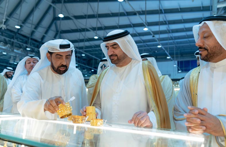 واطلع سموه على أحدث التشكيلات والمشغولات الذهبية والابتكارات في مجال الساعات، والتصاميم التقليدية والمعاصرة في عالم المجوهرات والألماس والأحجار الكريمة وتوقف سموه عند منصة المصممين الإماراتيين وشاهد ما يقدمونه من مجموعاتهم المبتكرة وتصاميمهم العصرية والتراثية من الذهب والمجوهرات.