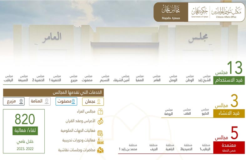 اعتمد سموّ الشيخ عمار بن حميد النعيمي، ولي عهد عجمان رئيس المجلس التنفيذي، خطةً لتشييد خمسة مجالس جديدة في إمارة عجمان في مناطق: الرقايب 1، منطقة الحميدية 2، منطقة الباهية، منطقة الجرف، منطقة محمد بن زايد 1، ليصل بذلك عدد المجالس في الإمارة إلى 21 مجلساً، موزعة في مختلف مناطق الإمارة، تعزيزاً للتلاحم المجتمعي بين أهل عجمان، ويُشرف مكتب شؤون المواطنين بحكومة عجمان على تشغيلها.