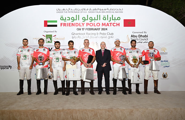وسبق اللقاء الودي الاستعراضي بين فريقي “غنتوت بولو” الإماراتي، و”مغاربة العالم للبولو” المغربي عزف النشيد الوطني الاماراتي والوطني الملكي المغربي مع تقديم اللاعبين المشاركين من الفريقين وطاقم حكام المباراة، والتي انتهت بفوز فريق غنتوت بولو 6 اهداف مقابل هدفين ونصف للفريق المغربي الشقيق ،وضمت قائمة فريق غنتوت يوسف بن دسمال، خالد بن دري، محمد بن دري(هداف اللقاء) وناصر الشامسي ،بينما لعب لفريق “مغاربة العالم للبولو” كريم ظريف، هشام زين، محمد حشاش، ولياس بن مرغي.