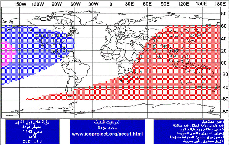 أعلن مركز الفلك الدولي في بيان له أمس أن غالبية دول العالم الإسلامي ستتحرى هلال شهر محرم لعام 1443 هجرية يوم الأحد القادم وسيحدث الاقتران المركزي في ذلك اليوم في الساعة 01:50 ظهرا بتوقيت غرينتش مشيرا إلى أن رؤية الهلال يوم الأحد مستحيلة من شرق العالم الإسلامي وغير ممكنة من باقي أجزائه وهناك إمكانية لرؤية الهلال يومها من خلال التلسكوب فقط وبصعوبة من أجزاء من القارة الأمريكية. وتوقع المهندس محمد شوكت عودة مدير مركز الفلك الدولي " أن يكون رأس السنة الهجرية يوم الثلاثاء 10 أغسطس في غالبية دول العالم الإسلامي. بالنسبة لوضع الهلال يوم الأحد القادم في بعض المدن العربية والإسلامية فإن الحسابات السطحية للهلال وقت غروب الشمس كما يلي " في جاكرتا سيحدث الاقتران بعد غروب الشمس وسيغيب القمر قبل غروب الشمس وفي أبو ظبي سيحدث الاقتران السطحي بعد غروب الشمس وعليه فإن رؤية الهلال من جاكرتا ومن أبوظبي مستحيلة. وفي مكة المكرمة سيغيب القمر بعد 14 دقيقة من غروب الشمس وعمره 40 دقيقة فقط وفي الرياض سيغيب القمر بعد 14 دقيقة من غروب الشمس، وعمره 24 دقيقة فقط وفي عمّان والقدس سيغيب القمر بعد 19 دقيقة من غروب الشمس وعمره ساعة واحدة و29 دقيقة وفي القاهرة سيغيب القمر بعد 18 دقيقة من غروب الشمس وعمره ساعة واحدة و38 دقيقة وفي الرباط سيغيب القمر بعد 24 دقيقة من غروب الشمس وعمره 05 ساعات و04 دقائق... ورؤية الهلال يوم الأحد من جميع المدن السابقة غير ممكنة حتى باستخدام التلسكوب.