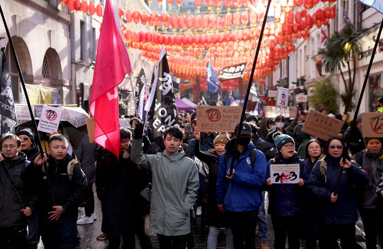 في لندن التي انتقلت إليها جالية كبيرة من هونغ كونغ بعد 2019، تجمّع نحو مائة متظاهر أمام مقر وزارة الخارجية وشؤون الكومنولث والتنمية، مطالبين بالحرية لهونغ كونغ.