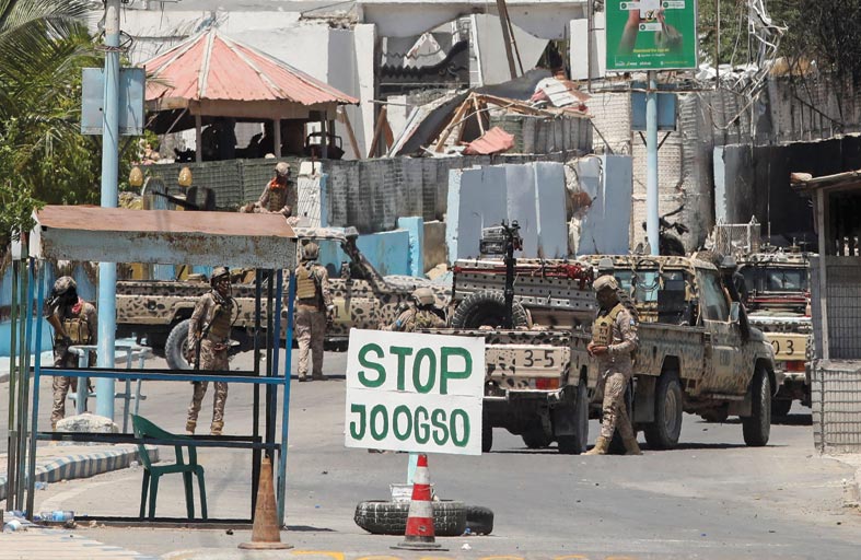 وقال المتحدث باسم الشرطة قاسم أحمد روبل، الجمعة: على حد علمي، قتل إرهابي وثلاثة حراس أمن الفندق وعضوان من جهاز الأمن في الهجوم.