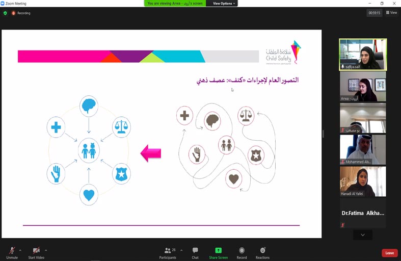 كما استعرض الاجتماع الإجراءات الحالية المتبعة في الجهات المعنية وصفة الضبطية القضائية واللغات المتوفرة لإعطاء الطفل والقائمين على رعايته معلومات حول قضيته وتطوراتها والأجهزة والأساليب المستخدمة في عملية تقييم حالة الطفل وعلاجه، وتطرق إلى البرامج الإلكترونية المستخدمة من قبل الشركاء بالإضافة إلى بيئة التعامل مع الطفل وفرص التعلم والتطوير المتاحة للمتخصصين.
