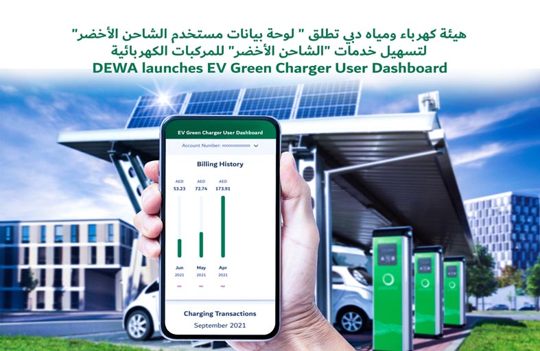 أطلقت هيئة كهرباء ومياه دبي " لوحة بيانات مستخدم الشاحن الأخضر" لتسهيل إدارة خدمات الشاحن الأخضر للمركبات الكهربائية حيث يمكن لمتعاملي الهيئة المسجلين في خدمة الشاحن الأخضر متابعة المعلومات المتعلقة بالشحن والاستهلاك بسهولة عبر التطبيق الذكي للهيئة وموقعها الإلكتروني.