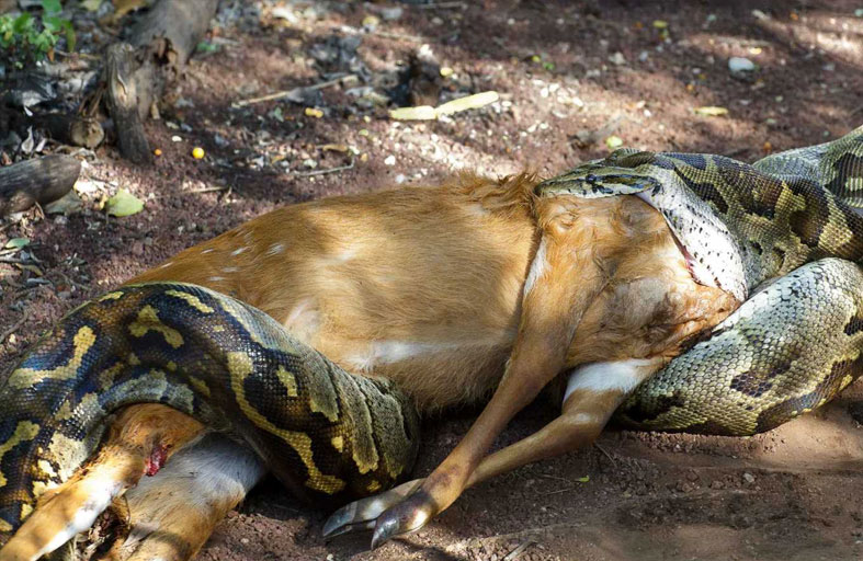 تشتهر الثعابين بقدرتها المذهلة على ابتلاع فرائس تبدو أكبر بكثير من حجم رؤوسها وأجسامها، مثل القوارض والطيور، بل وأحيانًا حيوانات يتجاوز عرضها عرض جسم الثعبان نفسه كالغزلان.
