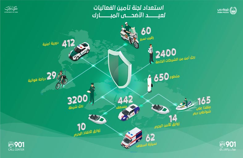 وقال الغيثي: إن لجنة تأمين الفعاليات أكملت استعداداتها لاستقبال عيد الأضحى المبارك من خلال إعدادها خطة أمنية كاملة تشمل كافة المساجد والمُصليات الكبيرة التي تقام بها صلاة العيد في دبي، ونشر دوريات مرورية ومتطوعين في كل أرجاء الإمارة، وفي المناطق الحيوية والسياحية والمراكز التجارية والأسواق المفتوحة لضمان إجراءات الأمن والسلامة وتحقق انسيابية حركة المرور، وتخفيف الازدحام، من خلال العمل الجاد والتعاون المشترك بين الإدارة العامة للمرور في شرطة دبي وشركائنا في هيئة الطرق والمواصلات الذين يعملون جنباً إلى جنب في جميع الفعاليات والمناسبات.
