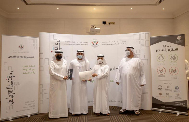 وجرى تكريم الجهات المشاركة وهي وزارة الصحة ووقاية المجتمع والقيادة العامة لشرطة الشارقة " ممثله مركز شرطة دبا الحصن " ودائرة التنمية الاقتصادية ودائرة الخدمات الاجتماعية ومجلس أولياء أمور الطلبة والطالبات بدبا الحصن وبلدية مدينة دبا الحصن ونادي دبا الحصن الرياضي والثقافي. أشاد سعادة سليمان بن جمعوه اليحائي رئيس مجلس مدينة دبا الحصن بمشاركة كافة الجهات المعنية والعاملة في مدينة دبا الحصن لتلاقي أدوارها في تقديم خدمة نوعية تمثلت في التوعية جراء جائحة كورونا وأشار إلى أن حملة (نلتزم...لننتصر) نجحت مع جهود الدولة في مجمل مرئياتها إلى توحيد الجهود المشتركة مع الجهات المشتركة في نشر ثقافة الوعي بخطورة الجائحة وتجنب بعض العادات السلبية بجانب التوعية بالنظافة وعلاقتها بالصحة العامة والعمل على إبراز دور مجالس الضواحي ومختلف الدوائر الحكومية المشاركة في التصدي لهذه الجائحة ووقاية الجميع من هذا الفيروس . وأعرب اليحيائي عن شكره لكافة الجهات المشاركة في هذه الحملة المجتمعية وما قدمته من أعمال مثلت دعما وتعزيزا لجهود المؤسسات المعنية في الدولة في وقاية المجتمع من فيروس كورونا .