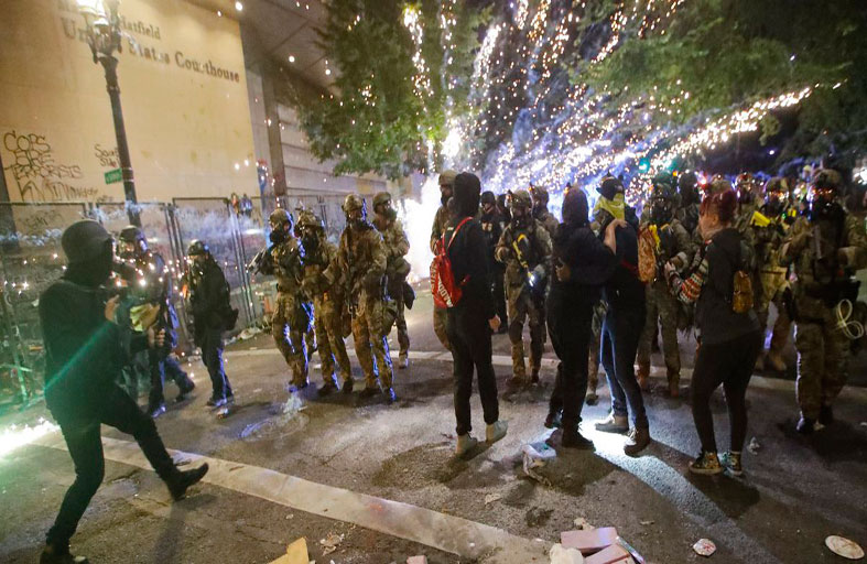 وتكررت الاشتباكات بين قوات أمن اتحادية تم إرسالها إلى المدينة الواقعة في شمال غرب البلاد وحشود المحتجين الذين استهدفوا مبنى المحكمة الاتحادية هناك. وقال مكتب مأمور شرطة مقاطعة مولتنوماه على تويتر “أعلنت شرطة بورتلاند أن التجمع القريب من مبنى حكومة مولتنوماه يثير الشغب بعدما قام أفراد بعمليات تخريب متكررة وهشموا نوافذ الطابق الأرضي بالحجارة وألقوا مواد حارقة على أحد المكاتب».