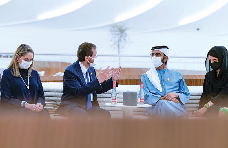 استقبل صاحب السمو الشيخ محمد بن راشد آل مكتوم نائب رئيس الدولة رئيس مجلس الوزراء حاكم دبي "رعاه الله" ، أمس فخامة إسحاق هرتسوغ، رئيس دولة إسرائيل، بحضور سمو الشيخ حمدان بن محمد بن راشد آل مكتوم، ولي عهد دبي وذلك في جناح دولة الإمارات بمقر "إكسبو 2020 دبي". ورحّب صاحب السمو الشيخ محمد بن راشد آل مكتوم بالرئيس إسحاق هرتسوغ والوفد المرافق له، في أول زيارة رسمية لدولة الإمارات، حيث تناول اللقاء مستقبل التعاون الاقتصادي والتجاري والاستثماري، كذلك رفع مستوى التعاون العلمي والتكنولوجي وغيرها من المسارات الداعمة لمستقبل التنمية.