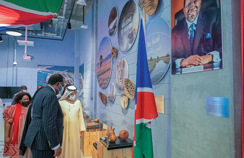 واطلع سموه خلاله زيارته والرئيس هيغ جينغوب إلى جناح ناميبيا على ما تقدمه الدولة الصديقة الواقعة في غرب أفريقيا والمطلة على سواحل المحيط الأطلنطي من ملامح للحياة في الدولة الأفريقية الغنية ببيئتها الطبيعية واسعة التنوع، ومعلومات حول موروثها الثقافي والاجتماعي الغني، فضلا عما تتمتع به ناميبيا من فرص اقتصادية ترتكز على ما تحفل به أراضيها من موارد طبيعية وثروة معدنية، في حين تروج ناميبيا لقدراتها في مجال السياحة والاقتصاد الأزرق، وما تقوم بتنفيذه من مشاريع البنى التحتية، فضلا عن ما تملكه من طاقة بشرية منتجة وماهرة.