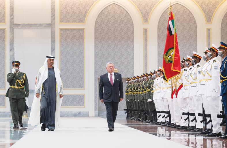 و جرت لضيف البلاد مراسم استقبال رسمية حيث اصطحب صاحب السمو الشيخ محمد بن زايد آل نهيان جلالة الملك عبدالله الثاني إلى منصة الشرف وعزف السلام الوطني لكل من دولة الإمارات والمملكة الأردنية الهاشمية فيما اصطفت ثلة من حرس الشرف تحية لجلالته وترحيباً بالزيارة.