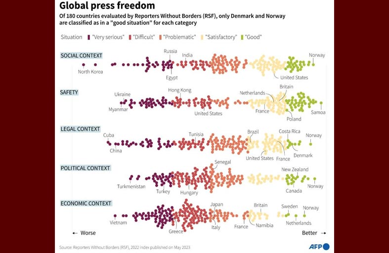 وأظهر التقرير السنوي أنّ تونس والسنغال كانتا من بين الدول التي تراجعت في الترتيب، فيما بقيت النروج في الصدارة وتذيّلت كوريا الشمالية الترتيب. ووفقاً لنسخة 2023 من هذا التصنيف، فإنّ ظروف ممارسة الصحافة سيّئة في 70% من الدول. وفي نسخته الـ21 حذّر التقرير خصوصاً من آثار المعلومات المضلّلة.