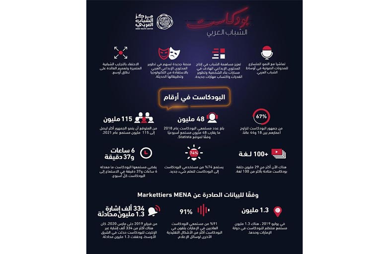 أعلن مركز الشباب العربي إطلاق «بودكاست الشباب العربي» كمنصة جديدة في متناول الشباب العربي تسهم في تطوير محتوى عربي إبداعي بالاستفادة من التكنولوجيا وتطبيقاتها الحديثة. ويقدم «بودكاست الشباب العربي»مساحة إبداعية جديدة مفتوحة للشباب العربي للتعبير عن تطلعاته وأفكاره الملهِمة وتسليط الضوء على القضايا التي تهمه بصيغة حلقات بودكاست قصيرة مكثّفة من مختلف البلاد العربية تقدم المعرفة والفائدة، وتسهل وصول ملايين الشباب في الوطن العربي إلى محتوى متجدد يحاكي اهتماماتهم.