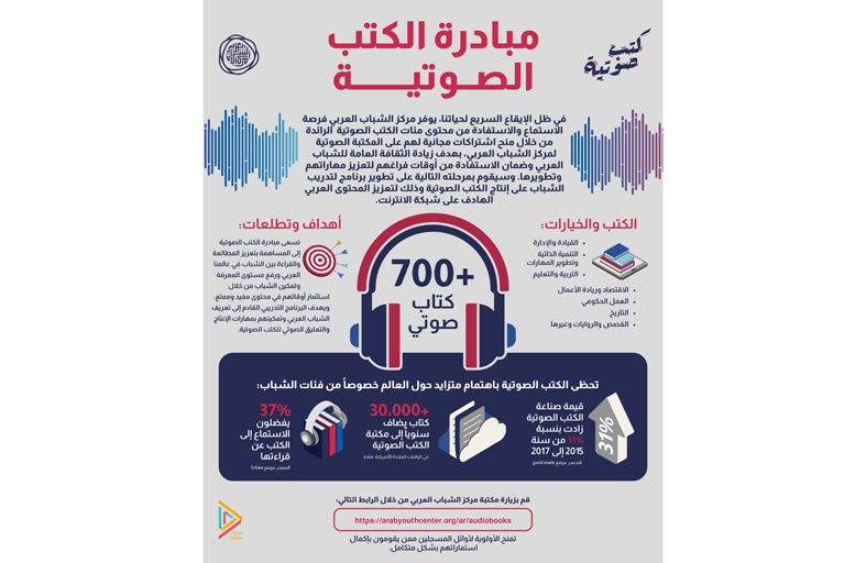 ومن خلال هذا الاشتراك المجاني سيتمكن الشباب من الوصول إلى مئات الكتب النوعية الصوتية في مجالات متنوعة كالقيادة والإدارة، والتنمية الذاتية، والاقتصاد، والقصص والروايات، وبما يسهم في تنمية المهارات والقدرات والمساهمة في بناء مجتمع إلكتروني متفاعل يجمع القراء والمؤلفين والناشرين في فضاء موحد يعزز انتشار الكتاب المسموع ويواكب تطور المنصات الرقمية التي تعمل على تحويل الكتب الورقية إلى إلكترونية ومسموعة بالتوافق مع أصحاب حقوق النشر. ويمكن للشباب من مختلف البلاد العربية المشاركة في المبادرة عبر رابط الكتب الصوتية على الموقع الإلكتروني لمركز الشباب العربي arabyouthcenter.org/ar/audiobooks ، حيث يستطيعون أيضاً تقييم محتوى مئات الكتب الصوتية المتوفرة وسرد تجاربهم وأفكارهم حول المبادرة والكتب المسموعة التي توفرها.