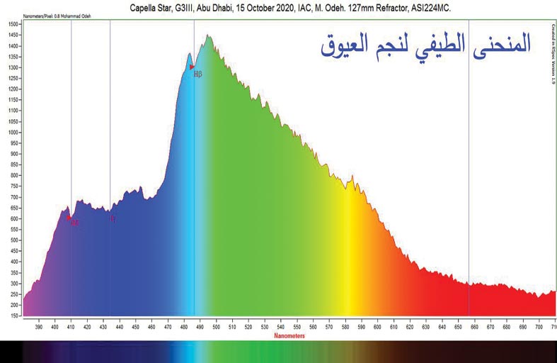 وعند تحليل الطيف ظهرت خطوط الامتصاص الرئيسة لهذا النوع من النجوم وهي خطوط هيدروجين ألفا وهيدروجين بيتا وهيدروجين جاما وهيدروجين دلتا وتنتج هذه الخطوط جراء امتصاص إلكترونات ذرة الهيدروجين المتواجدة في جو النجم لجزء من طيف النجم الرئيس وبالنظر إلى الصورة المرفقة يلاحظ تطابق الخطوط الزرقاء وهي خطوط معيارية مرسومة مسبقا من قبل برنامج الحاسوب مع قيعان المنحنى الذي تم الحصول عليه من الرصد مما يدل على دقة الرصد وتطابقه من النتائج العالمية.