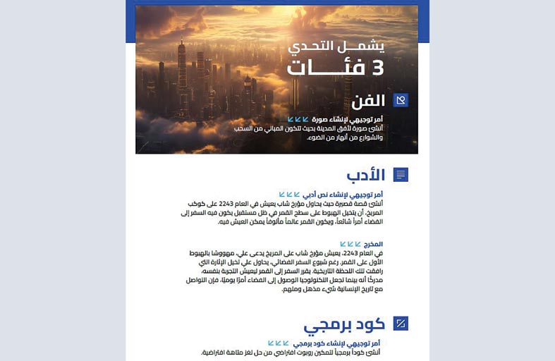 واعتبر سعيد الفلاسي مدير مركز دبي لاستخدامات الذكاء الاصطناعي، أن "التحدي الدولي للذكاء الاصطناعي" هو أحد أكبر المسابقات حول العالم في هندسة الأوامر البرمجية، التي أصبحت واحدة من أكثر المهارات الواعدة في المستقبل، مشيرا إلى التحدي استطاع أن يجتذب آلاف المشاركات التي تم تقديمها من نحو 100 دولة حول العالم، ضمن 3 فئات رئيسة هي الفن والأدب والبرمجة بالتعاون مع عدد من كبريات الشركات التكنولوجية العالمية.