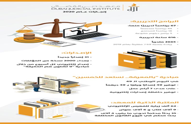 انطلاقاً من حرصه على إبراز دوره الرئيسي المتمثل في إعداد وتأهيل وتدريب الكوادر الوطنية من أبناء دولة الإمارات، ونشر الوعي القانوني في المجتمع، أعلن معهد دبي القضائي عن التقرير الإحصائي لإنجازاته خلال العام 2020، والتي كان من أبرزها تنظيم 67 برنامجاً تدريبياً، توزعت بين 44 برنامجاً متخصصاً، و 18 برنامجاً لعامة الجمهور.