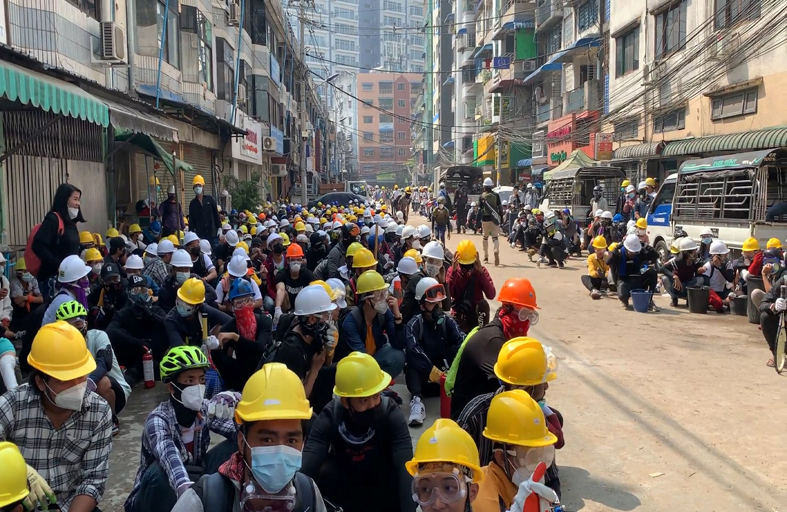 في وسط رانغون، العاصمة الاقتصادية للبلاد، نظم اعتصام المتظاهرون وقاموا بوضع أغطية صناديق القمامة على الأرض لاستخدامها كدروع.