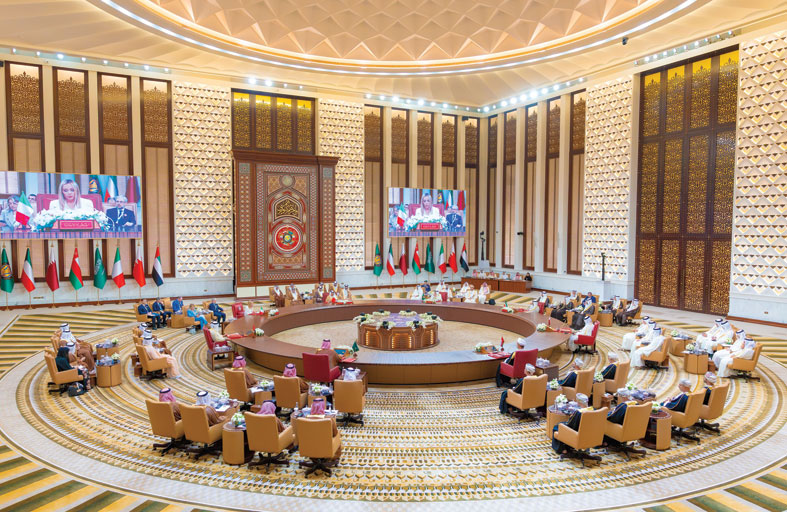 اختتمت أمس في قصر الصخير أعمال القمة الخليجية السادسة والأربعون برئاسة صاحب الجلالة الملك حمد بن عيسى آل خليفة ملك مملكة البحرين وبمشاركة أصحاب الجلالة والسمو قادة دول مجلس التعاون لدول الخليج العربية ورؤساء الوفود. وألقى جلالة ملك البحرين في ختام القمة كلمة أكد فيها حرص دول المجلس على تعزيز مسيرة التعاون الخليجي، وتحصين أمن المنطقة، واستكمال مشاريع التكامل الاقتصادي، مشددًا على أهمية المضي في مسارات الأمن الغذائي والمائي والاقتصاد الرقمي، ومواصلة دعم الجهود السياسية الرامية لتحقيق الاستقرار الإقليمي، وفي مقدمتها دعم الحل العادل والشامل للقضية الفلسطينية. كما ألقت معالي جورجيا ميلوني رئيسة وزراء إيطاليا كلمة عبرت فيها عن تقدير بلادها للشراكة الإستراتيجية مع دول مجلس التعاون، مؤكدة دعم إيطاليا لتعزيز الأمن الإقليمي، وتوسيع مجالات التعاون الاقتصادي والتقني، خصوصًا في مجالات الطاقة النظيفة، والتحول الرقمي، والأمن البحري، مشددة على أهمية الدور الخليجي في استقرار المنطقة. من جانبه، قدّم معالي جاسم محمد البديوي الأمين العام لمجلس التعاون لدول الخليج العربية، عرضًا لأبرز ما تحقق خلال عام 2025، مشيرًا إلى التقدم في مشاريع التكامل الاقتصادي، وتطوير منظومة الأمن والدفاع المشترك، وتنفيذ برامج الشراكات الدولية، إضافة إلى ما حققته دول المجلس من جهود موحدة في مواجهة التحديات الإقليمية الأخيرة، مؤكدًا ثبات الموقف الخليجي تجاه دعم القضية الفلسطينية. واختُتمت القمة بالتأكيد على مواصلة التنسيق المشترك، وتعزيز العمل المؤسسي، ودعم مسارات التكامل والتعاون بما يحقق التنمية والازدهار لشعوب دول المجلس.