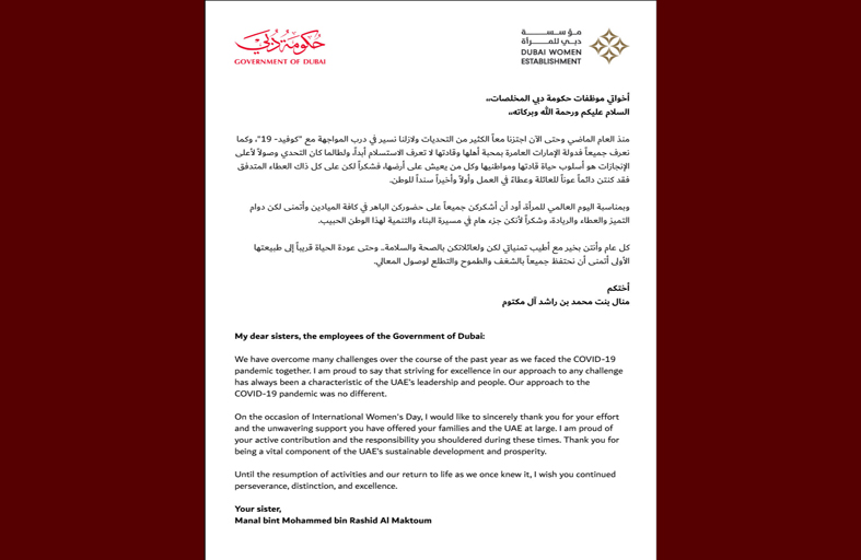 وقالت سموها في رسالة بعثت بها عبر البريد الإلكتروني لكافة موظفات حكومة دبي بمناسبة يوم المرأة العالمي الذي يصادف 8 مارس من كل عام: "منذ العام الماضي وحتى الآن اجتزنا معا الكثير من التحديات ولازلنا نسير في درب المواجهة مع "كوفيد- 19" وكما نعرف جميعا فدولة الإمارات العامرة بمحبة أهلها وقادتها لا تعرف الاستسلام أبدا ولطالما كان التحدي وصولا لأعلى الإنجازات هو أسلوب حياة قادتها ومواطنيها وكل من يعيش على أرضها فشكراً لكن على كل ذاك العطاء المتدفق فقد كنتن دائما عونا للعائلة وعطاء في العمل وأولا وأخيرا سندا للوطن".