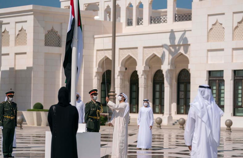 منصور بن زايد يرفع علم الإمارات على سارية قصر الوطن