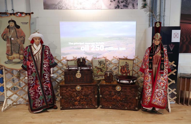 ويعرض الجناح جزءاً مصغراً لبعض كنوز منغوليا ، ليجد الزوار التاج الذهبي لبلج خان من القرن السابع الميلادي، ومن تلك الأواني التي تعود إلى أوائل العصر الحديدي، "مرجل برونزي" ، بالإضافة إلى أطباق وأواني ذهبية تعود إلى القرن السابع الميلادي ، فضلاً عن النقود الورقية المعروفة باسم "تشاو" من أسرة يوان ، وعملات برونزية لجنكيز خان صنعت في سمرقند، وعملات من بلاد فارس، وبعض المخطوطات الأثرية أبرزها رسالة خان أرجون إلي فيليب ملك فرنسا.