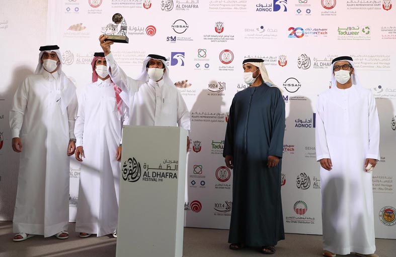 وتوج معالي اللواء فارس خلف المزروعي، القائد العام لشرطة أبوظبي رئيس لجنة إدارة المهرجانات والبرامج الثقافية والتراثية، الفائزين بأشواط المفاريد المحليات والمهجنات الأصايل في مزاينة الإبل بمهرجان الظفرة بدورته 15، التي تقام تحت رعاية صاحب السمو الشيخ محمد بن زايد آل نهيان ولي عهد أبوظبي نائب القائد الأعلى للقوات المسلحة، وبتنظيم من لجنة إدارة المهرجانات والبرامج الثقافية في أبوظبي.