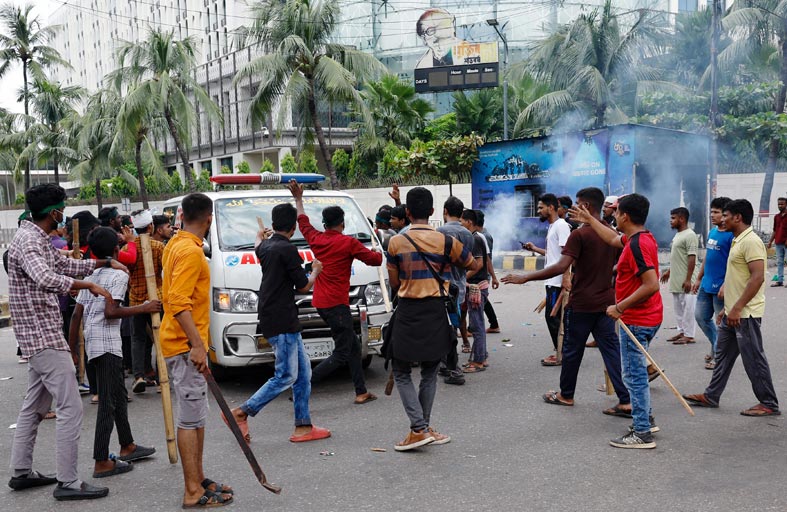 ونزل آلاف المتظاهرين الذين حمل العديد منهم العصي، واحتشدوا في ساحة شاهباغ بوسط دكا فيما اندلعت مواجهات في العديد من المواقع وفي مدن رئيسية أخرى على ما قالت الشرطة. وقال مفتش الشرطة الهلال لوكالة فرانس برس «وقعت اشتباكات بين طلاب ورجال الحزب الحاكم» مضيفا أن شابين قُتلا في حي موشيغانج بدكا.