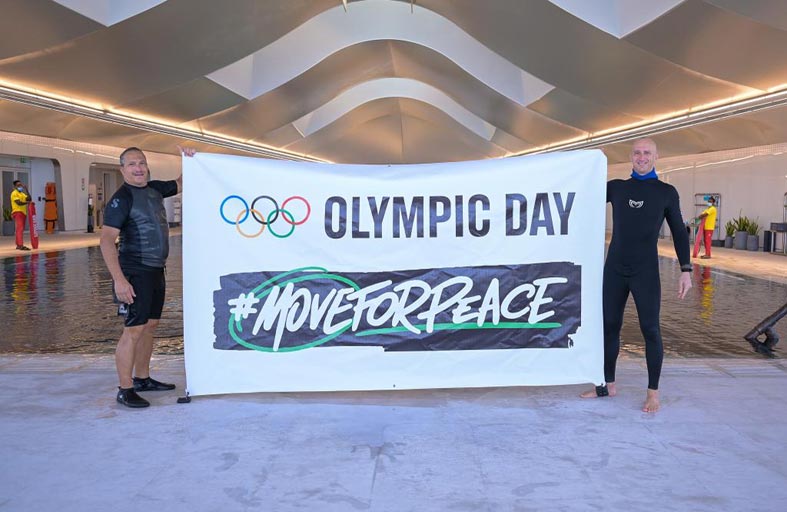 من ناحية أخرى حرصت مجموعة من الغواصين على إبراز لافتة اليوم الأولمبي وشعار الحركة من أجل السلام ب"ديب دايف دبي" أعمق حوض للغوص في العالم، وذلك احتفاءً باليوم الأولمبي وترويجاً للحدث ودعوة جميع فئات المجتمع للمشاركة فيه.