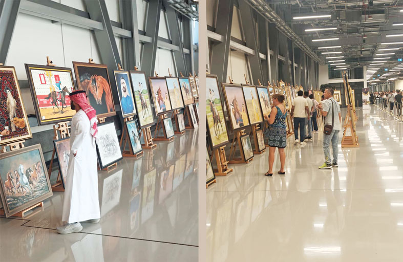 ومن تلك الأعمال الفنية الرائعة كانت لوحات لصور أصحاب السمو حكام الإمارات التي نفذت بأدق التفاصيل وزينت بزخارف من الذهب الخالص والأحجار الكريمة.. وأيضا شمل المعرض على لوحات لخيول عربية أصيلة وصقور الصيد وبعضا من البيئة المحلية وفنون الصناعات التقليدية..