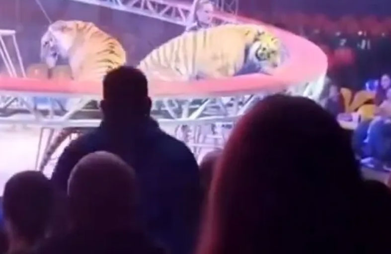 وبدأ المشهد، الذي انتشر على نطاق واسع عبر الإنترنت، بعرض 3 نمور تقف على كراسٍ، بينما تتجول المروضة ومساعدها على خشبة المسرح، وتفصلهم عن الجمهور شبكة دائرية.