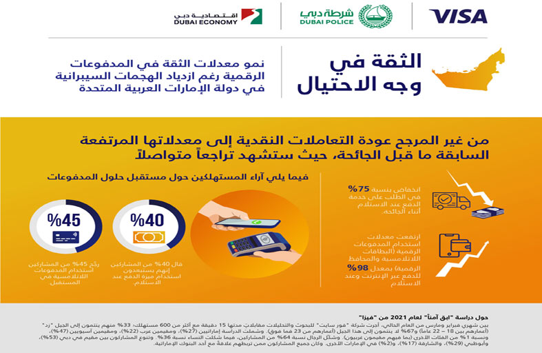 نمت معدلات الثقة بالمدفوعات الرقمية واستخدامها في المتاجر التقليدية والإلكترونية،في دولة الإمارات حيث يواصل المستهلكون تفضيلها عن الدفع النقدي بفضل التطورات التقنية ومعايير الأمان التي تمنحهم شعوراً متزايداً بالأمان لدى استخدام هذه الطرق للدفع لقاء مشترياتهم، وذلك وفقاً لدراسة "ابق آمناً 2021" التي كشفت عنها اليوم "شرطة دبي" و"اقتصادية دبي" وشركة "فيزا" العالمية المتخصصة في مجال تكنولوجيا المدفوعات الرقمية والمدرجة في بورصة نيويورك بالرمز "V".