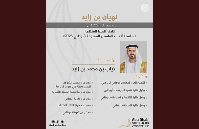 أصدر سمو الشيخ نهيان بن زايد آل نهيان، رئيس مجلس أبوظبي الرياضي، قراراً بتشكيل اللجنة العليا المُنظِّمة لسلسلة ألعاب الماسترز المفتوحة (أبوظبي 2026)، برئاسة سمو الشيخ ذياب بن محمد بن زايد آل نهيان، وعضوية الأمين العام لمجلس أبوظبي الرياضي، ووكلاء كل من دائرة تنمية المجتمع - أبوظبي، ودائرة الثقافة والسياحة - أبوظبي، ودائرة الصحة - أبوظبي، ومدير عام مكتب الشؤون الإستراتيجية في ديوان الرئاسة، ومدير عام مؤسَّسة التنمية الأسرية، ومدير عام بلدية أبوظبي، ومدير عام مركز النقل المتكامل، وممثّل عن شرطة أبوظبي.