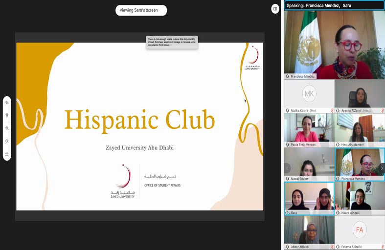 وتناول الاجتماع عرضا من قبل الطالبتين ريم المرزوقي رئيسة النادي اللاتيني بجامعة زايد وسارة المرزوقي نائبة رئيس النادي قدمتا خلاله نبذة عن النادي الذي تأسس من قبل طالبات جامعة زايد سنة 2018 و يضم الآن حوالي 60 عضوا. وعرضتا خلال الاجتماع أهداف تأسيس النادي اللاتيني والأنشطة التي قام بها منذ تأسيسه إلى جانب طرح بعض الاقتراحات لمشاريع مستقبلية بالشراكة مع سفارة المكسيك في الدولة و جامعات مكسيكية. يشار إلى أن جامعة زايد تقدم دروسا للغة الإسبانية في حرميها بدبي و أبوظبي لجميع فئات المجتمع من داخل و خارج الجامعة بالتعاون بين معهد خدمة المجتمع بجامعة زايد و معهد UCAM الاسباني والمعتمد دوليا في الدولة.