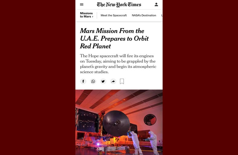 تابعت الصحف والمجلات العالمية المرموقة تغطيتها الواسعة لمهمة الإمارات لاستكشاف المريخ على بعد ساعات فقط من دخول مسبار الأمل مدار كوكب المريخ في سابقة تاريخية تعزز مكانة الإمارات المتنامية كمركز للعلوم والمعارف الفضائية. وجديد التغطية العالمية المستمرة لمهمة مسبار الأمل، تقرير نشرته صحيفة نيويورك تايمز اليومية الأمريكية العريقة امس سلطت فيه الضوء على اللحظات الأخيرة من المرحلة الحاسمة في رحلة مسبار الأمل الإماراتي الذي من المقرر أن يدخل مدار كوكب المريخ ، ليكون بذلك أول مهمة عربية إلى الفضاء العميق وصولاً إلى الكوكب الأحمر. وأشار تقرير الصحيفة إلى أن المسبار حال نجاحه في دخول المدار المحدد له حول المريخ، سيبدأ مهمته العلمية في دراسة الغلاف الجوي للكوكب الأحمر وأحوال الطقس عليه، لكن في حال حدوث أي مشكلة تتسبب في خروج المركبة من المدار والإبحار في النظام الشمسي، فهذا سيعني انتهاء المهمة عند هذه المرحلة.